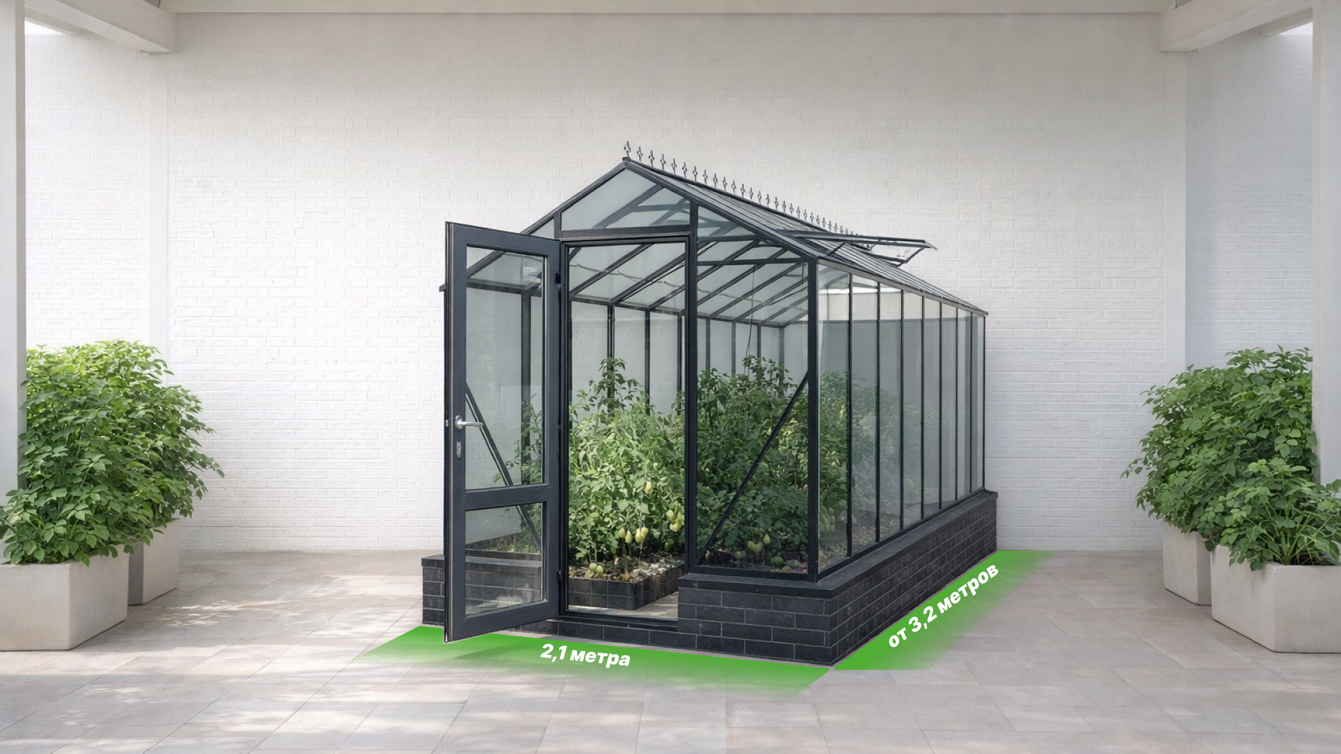 - Ширина 2,1 метра и высота 2,3 метра формируют гармоничные пропорции, благодаря которым конструкция сохраняет чёткий силуэт и удобно размещается даже на компактном участке, а вы получаете комфортное внутреннее пространство для выращивания овощей и зелени.