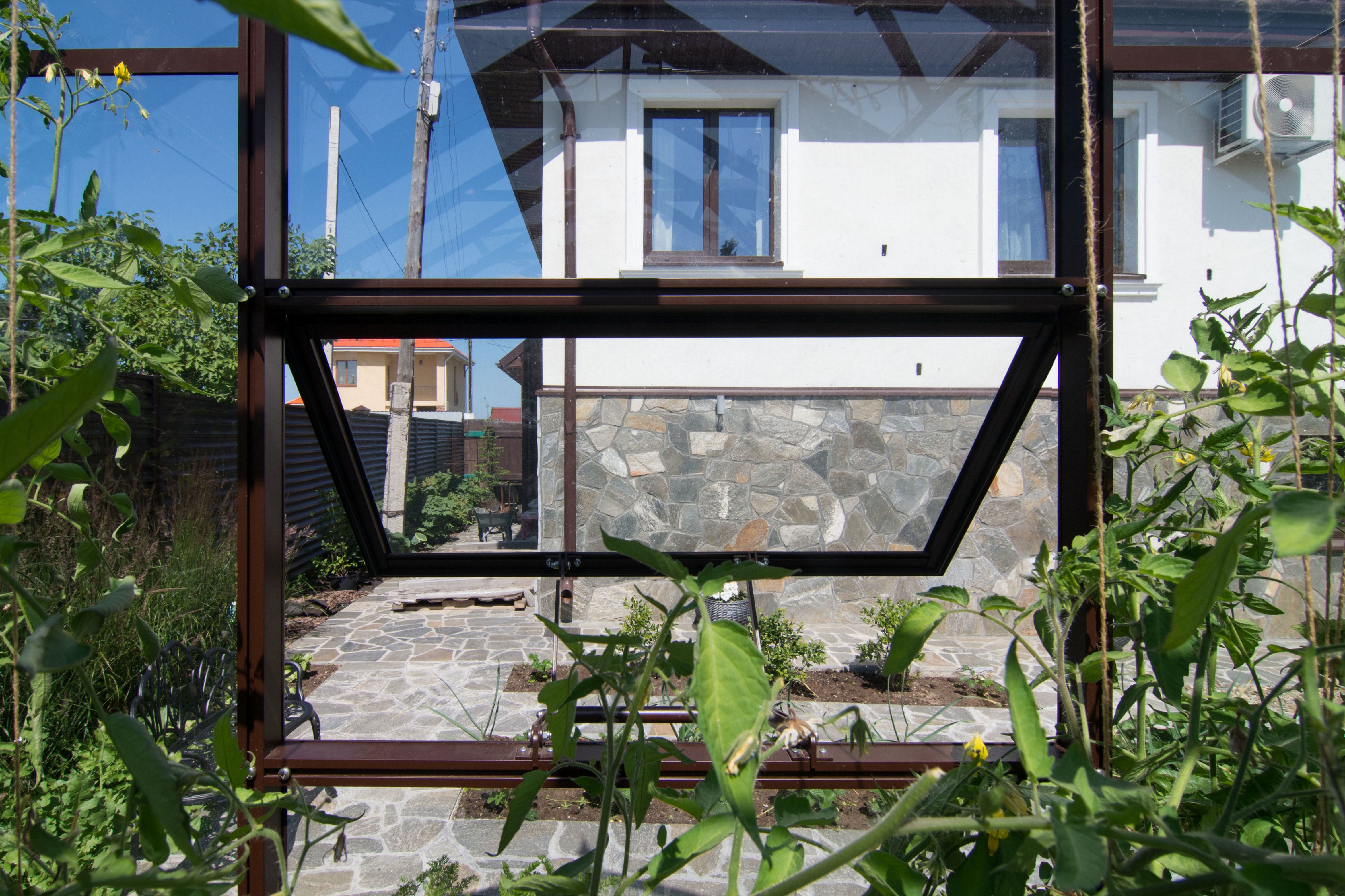 В теплице используется сырое либо закалённое стекло, предназначенное для тепличных конструкций. Закалённое стекло проходит термическую обработку, за счёт чего приобретает повышенную прочность и устойчивость к температурным перепадам. Материал отлично пропускает солнечный свет, не мутнеет со временем и сохраняет эстетичный внешний вид.