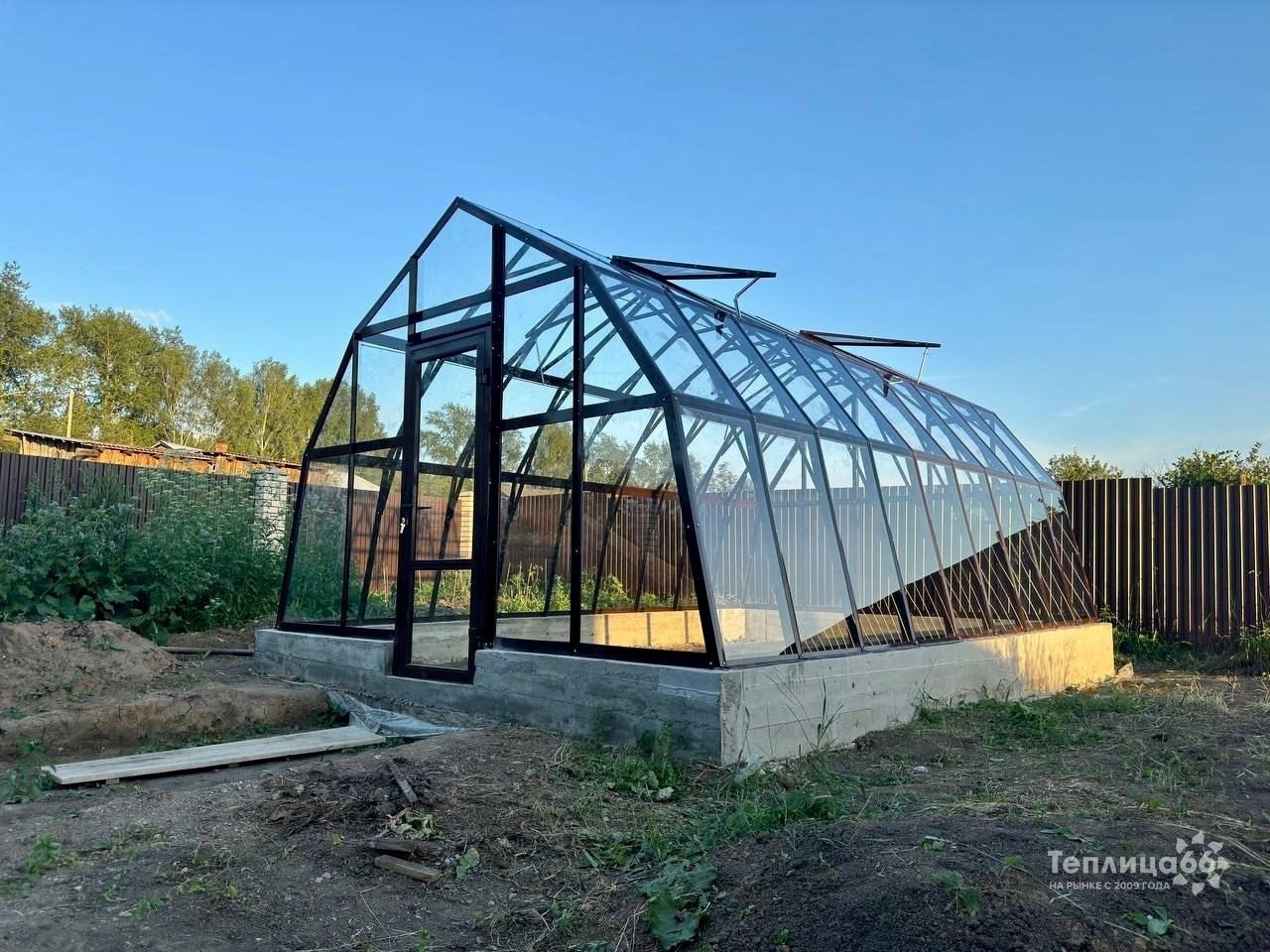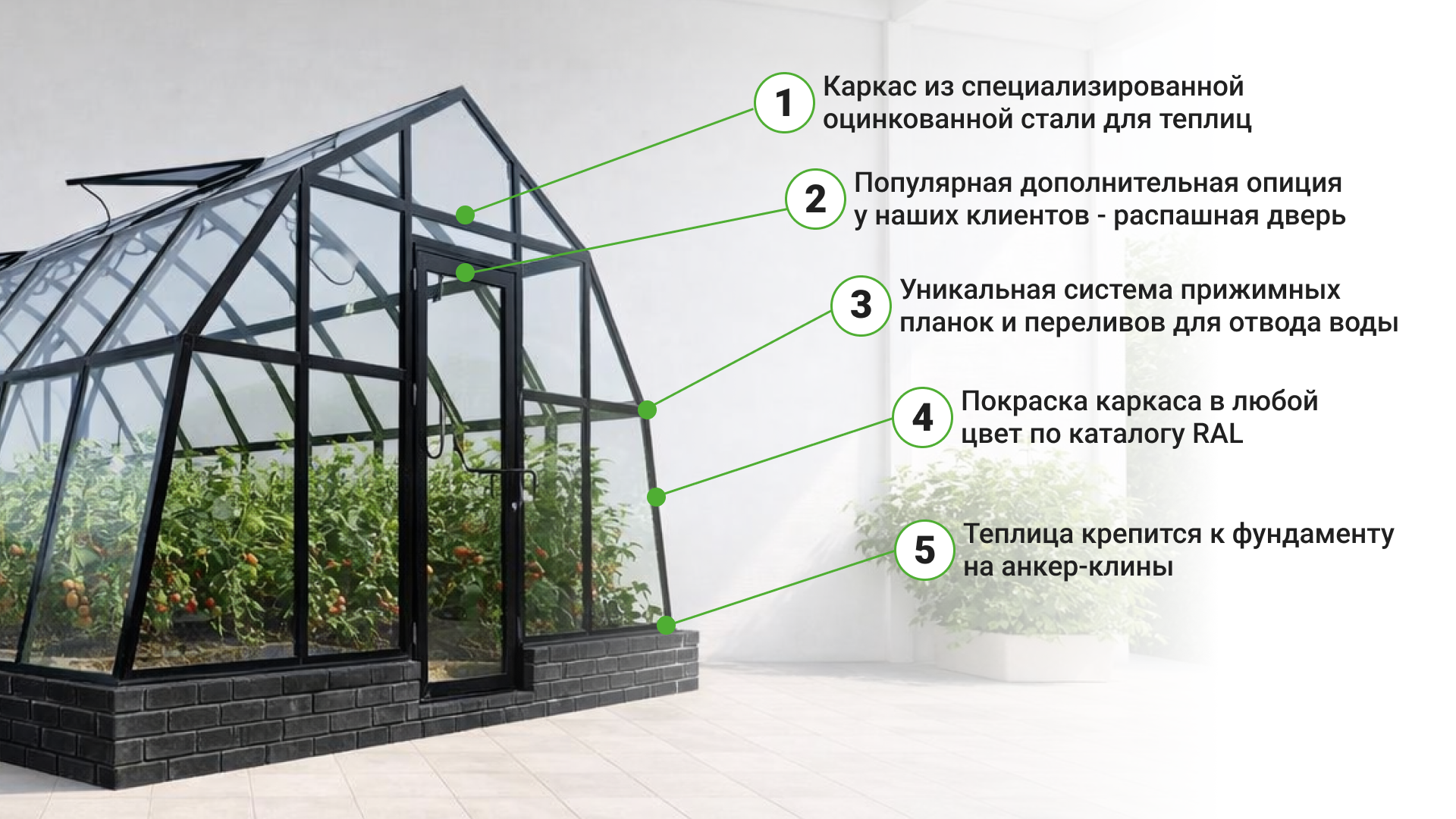 Модель входит в линейку теплиц нашего производства шириной от 2,6 до 5,0 метров. В конструкции используется 533 уникальные детали, что формирует не только аккуратную стеклянную геометрию, но и надёжность на десятилетия.