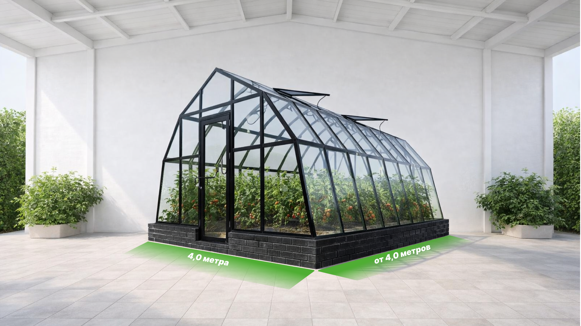 - Ширина 4,0 метра и высота 2,7 метра формируют просторный внутренний объём. Увеличенный воздушный буфер стабилизирует температуру, вы получаете комфортные условия для высокорослых культур и удобство работы в полный рост.