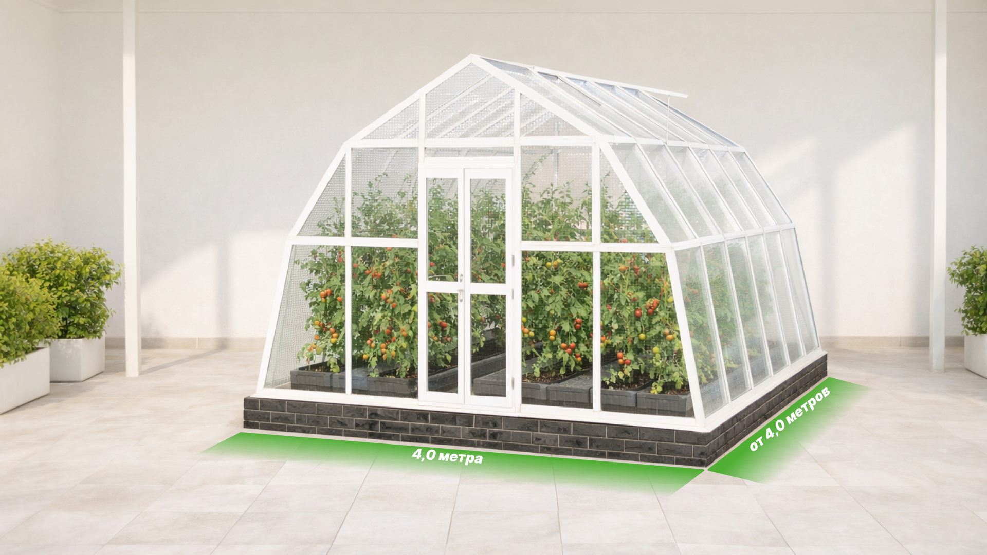 - Ширина 4,0 метра и высота 2,7 метра формируют просторное внутреннее пространство, благодаря чему вы получаете больше полезной площади для грядок и удобный проход по центру, а сама конструкция сохраняет гармоничные пропорции и визуальный баланс на участке.