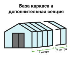 Длина: от 4 м и более — благодаря секциям 0,65м и 0,35м, теплица почти гарантированно встанет на любой размер фундамента.
