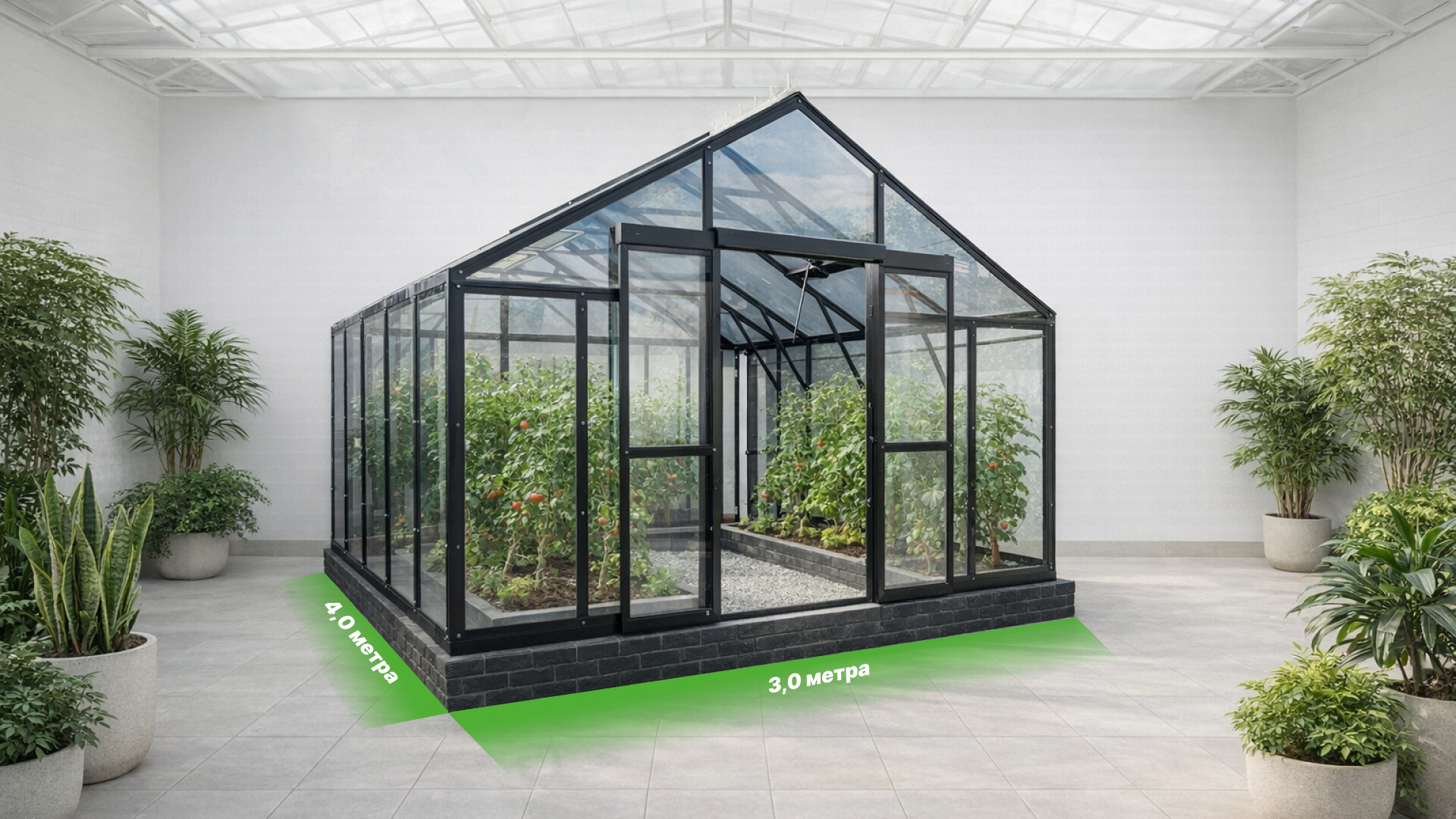 - Ширина 3,0 метра и высота 2,4 метра формируют просторный внутренний объём, что обеспечивает свободное размещение грядок и удобство работы, и вы получаете гармоничные пропорции с чётким силуэтом, который сохраняет визуальный баланс на участке.